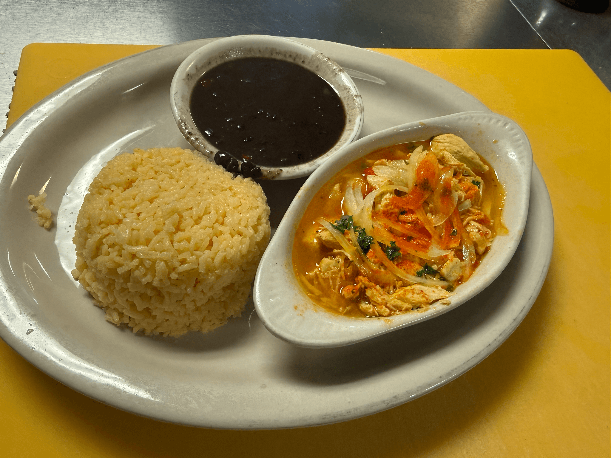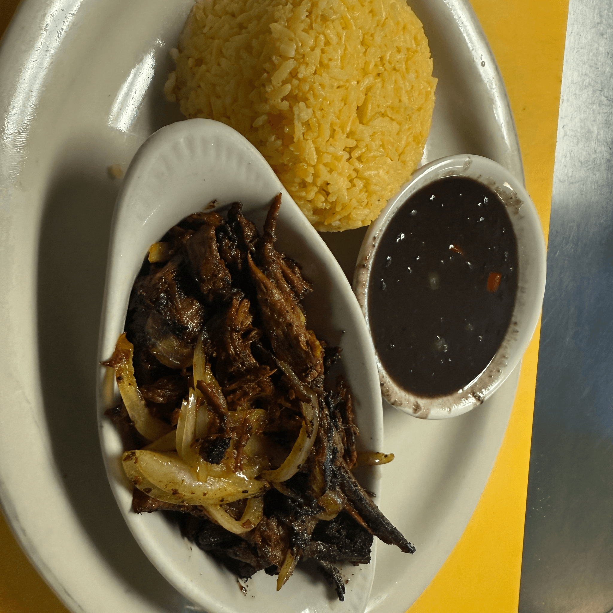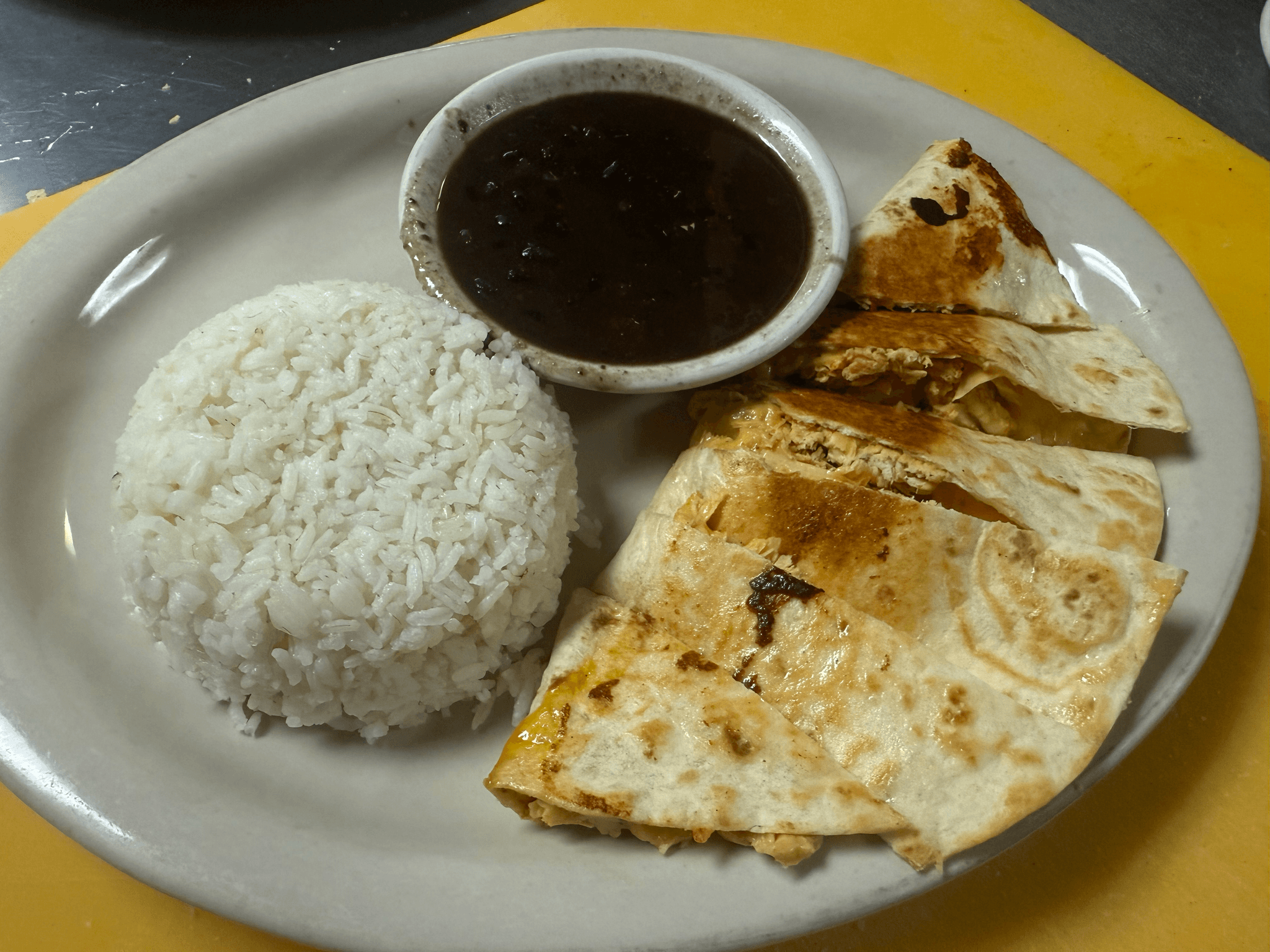Flour tortilla filled with shredded chicken or roasted pork and mixed cheese, served with black beans and white or yellow rice