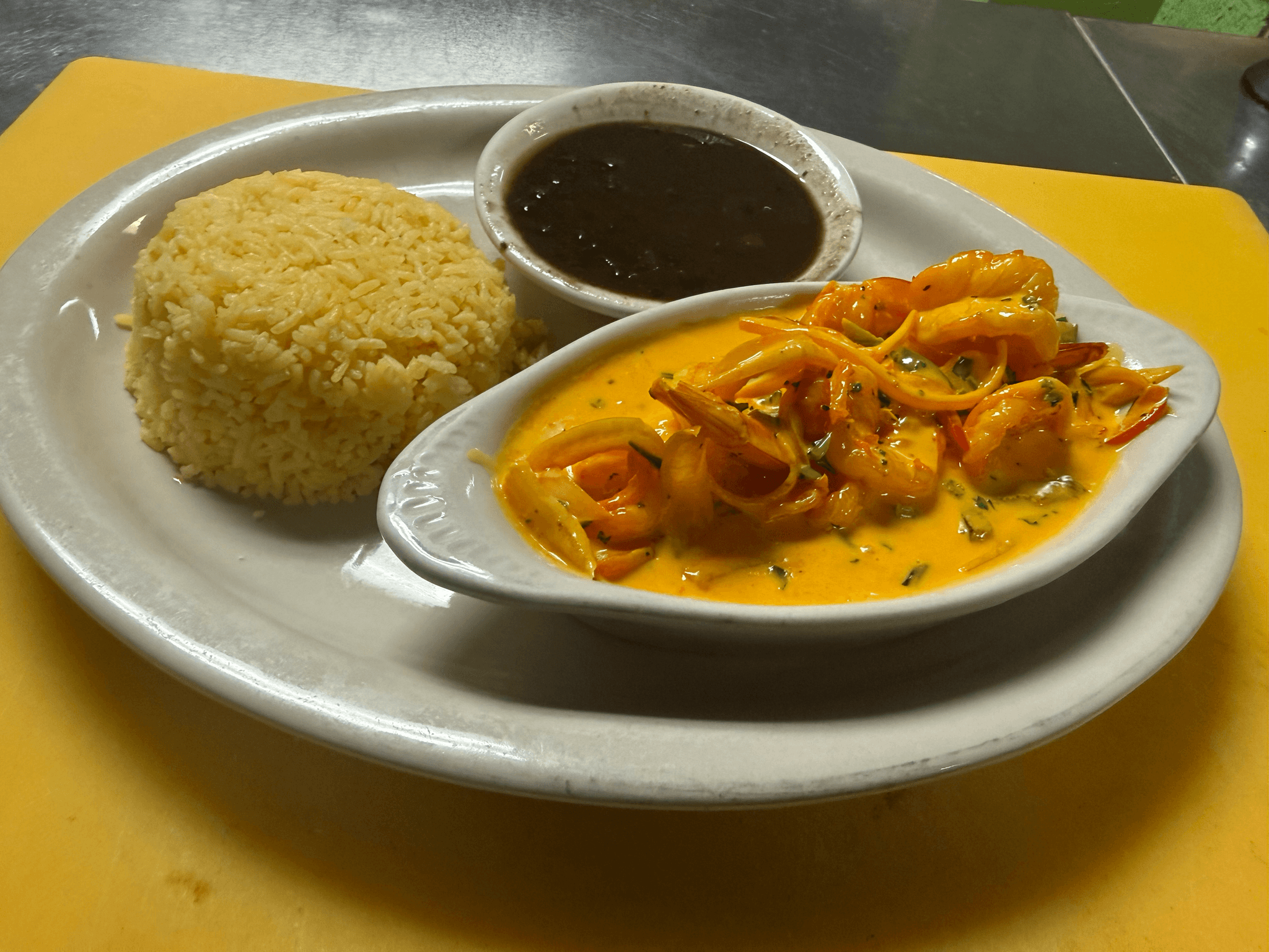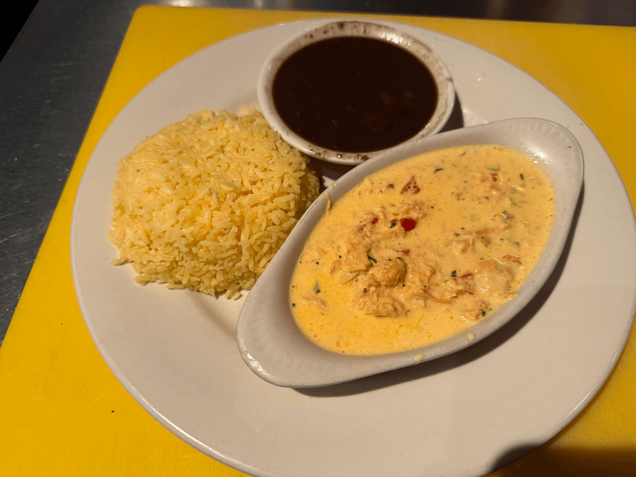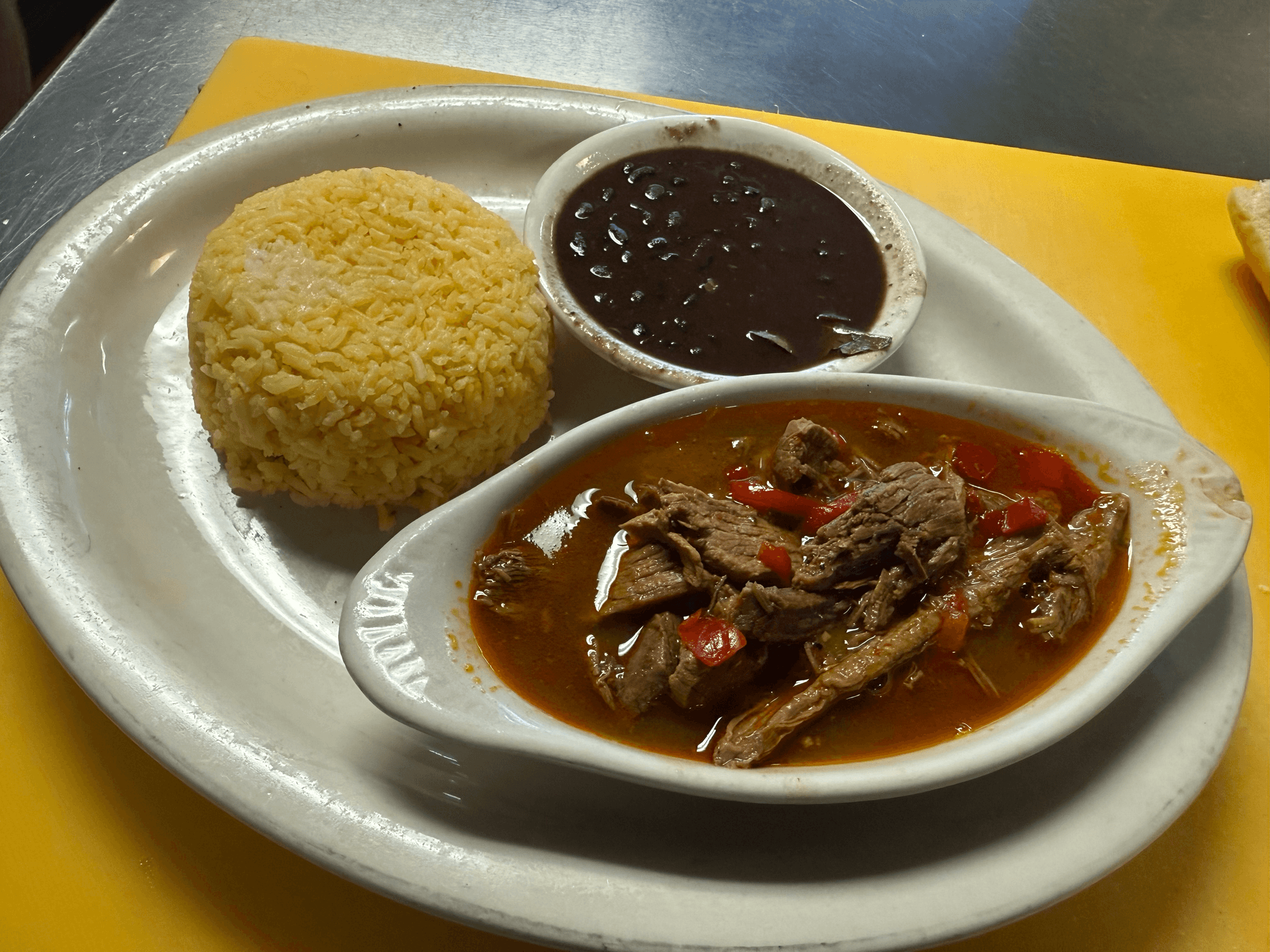 Flour tortilla filled with shredded chicken or roasted pork and mixed cheese, served with black beans and white or yellow rice