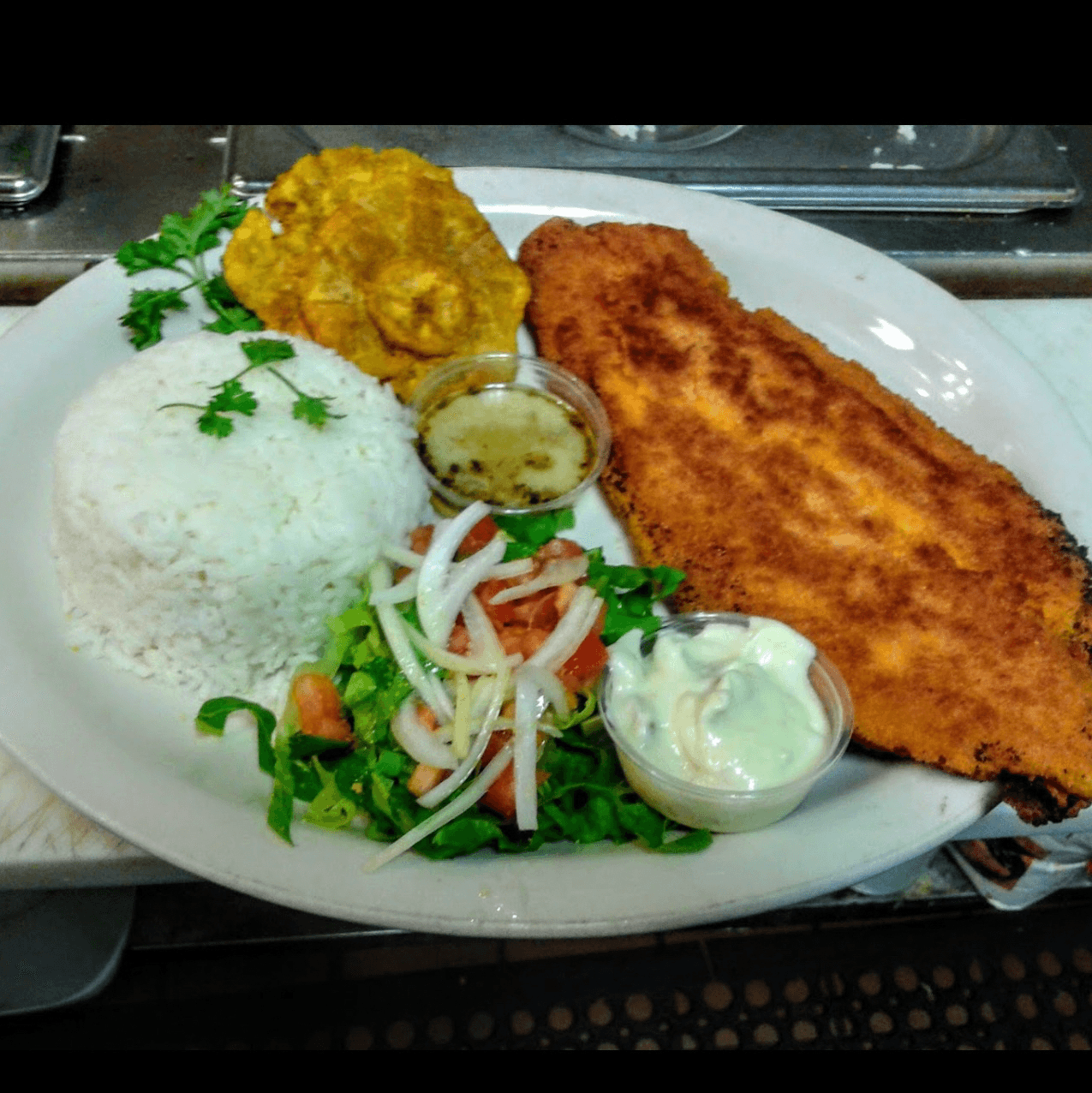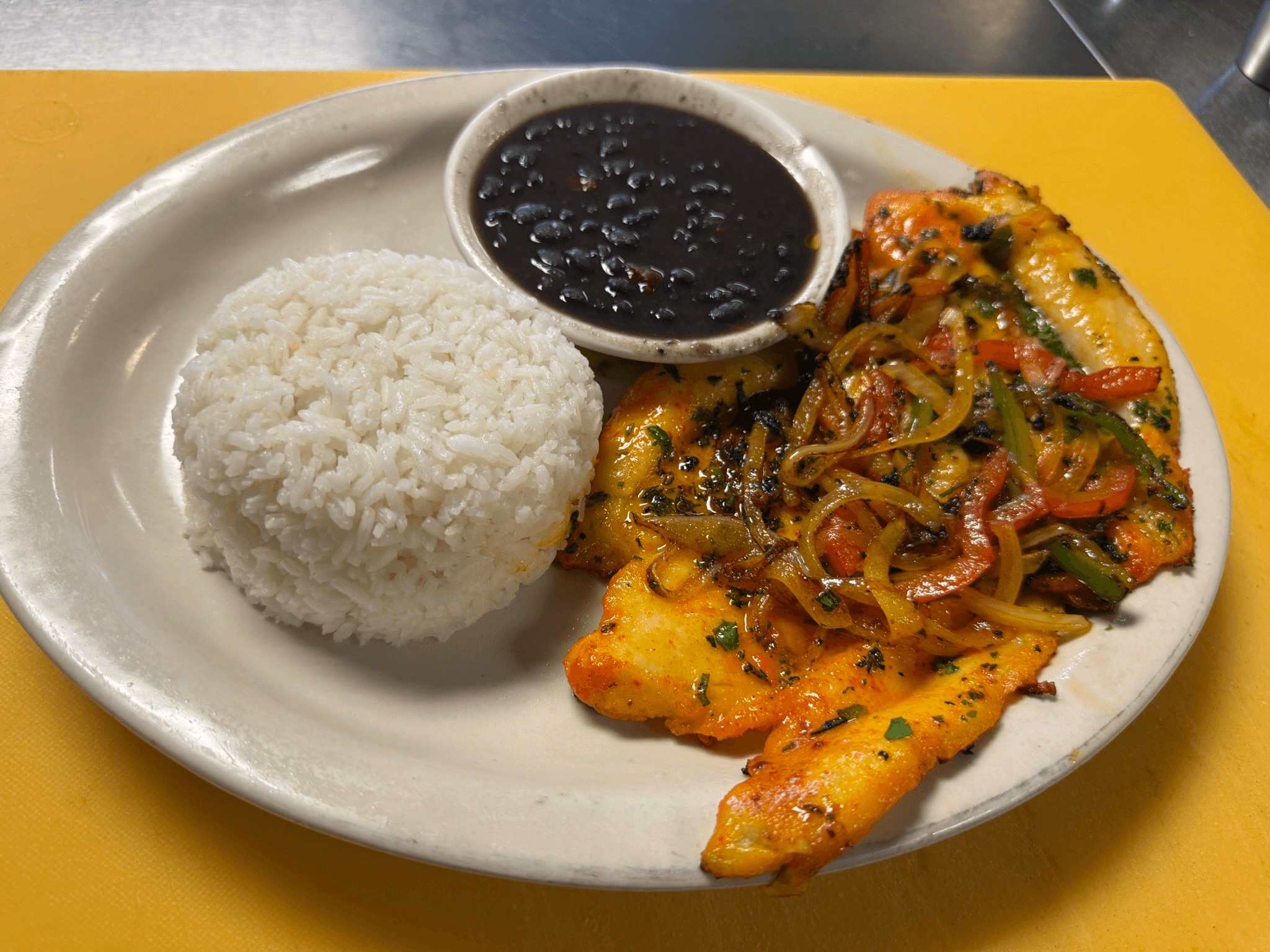 Cuban style chicken steak cooked on flat grill seasoned with our house garlic mojo sauce topped with fresh sautéed onions & peppers