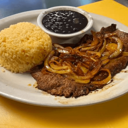 Thin Cuban style steak cooked on a flat grill seasoned with our special house mojo sauce topped with fresh sautéed onions