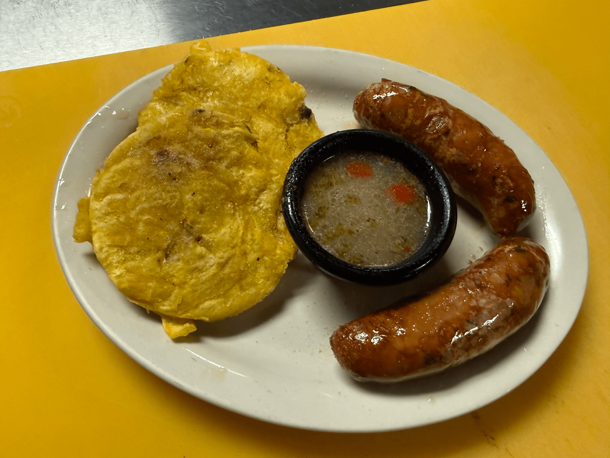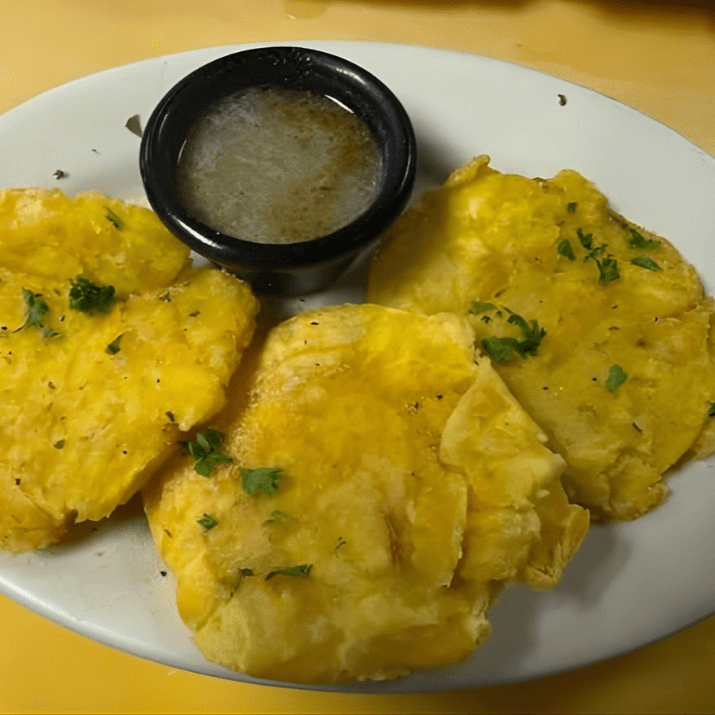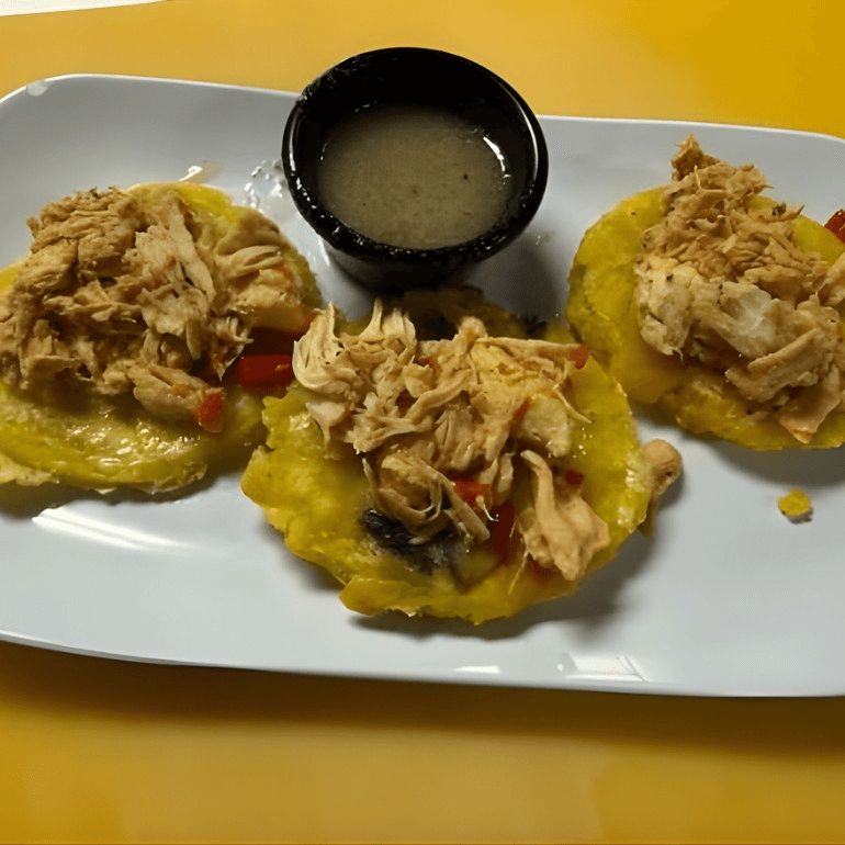 Thick slices of fried green plantains layered with roasted pork or chicken topped with our special Cuban style mojo sauce